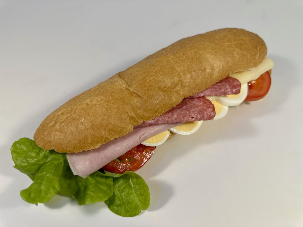 bageta, sýr eidam, salám vysočina, šunka, čerstvé rajče, čínské zelí, vařené vejce, majonéza, salát lolo biondo