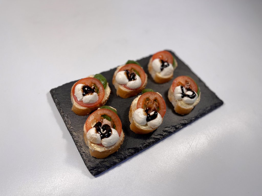 Složení: plátek bagety, máslo, čerstvé rajče, mozzarella, balzamický ocet, bazalka