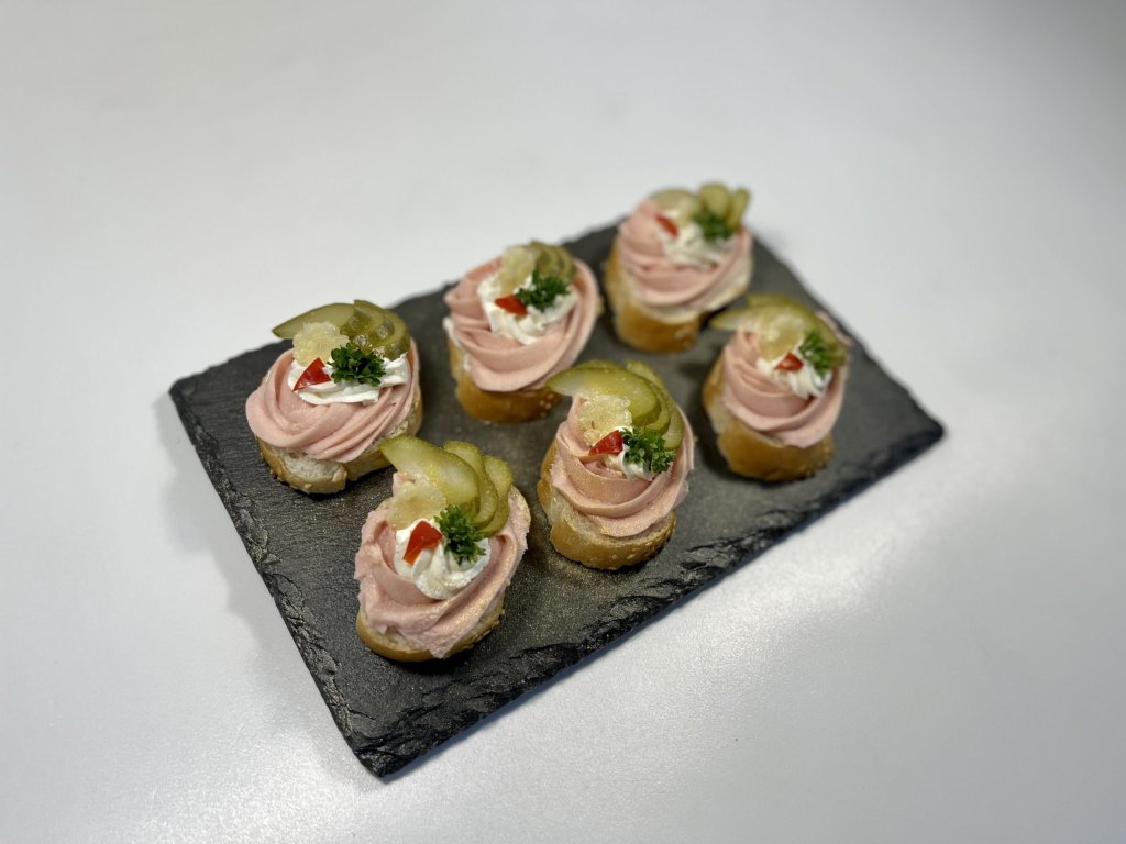 Složení: plátek bagety, pomazánkové máslo, šunková pěna, sterilovaný okurek, petrželová nať