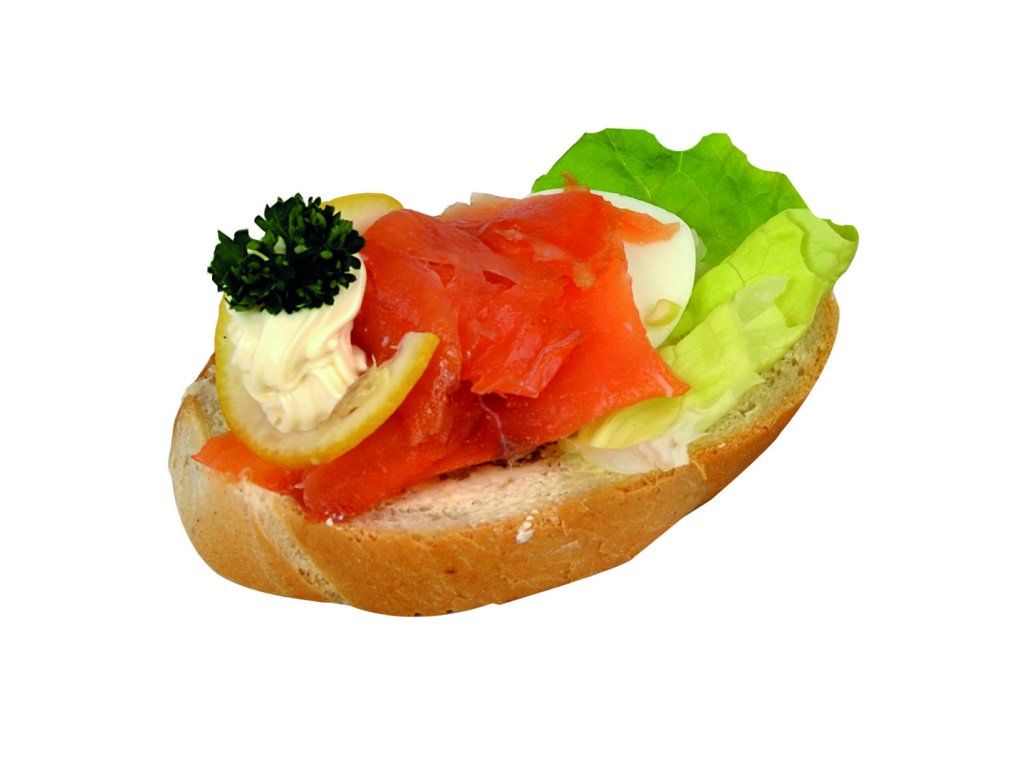 veka, máslo, losos uzený plátky, vařené vejce, čerstvá cibule, hlávkový salát, citron, majonéza, petrželová nať