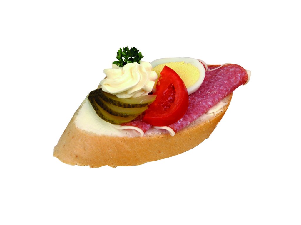 veka, máslo, kässe salám, tavený sýr, vařené vejce, sterilovaný okurek, čerstvé rajče, petrželová nať