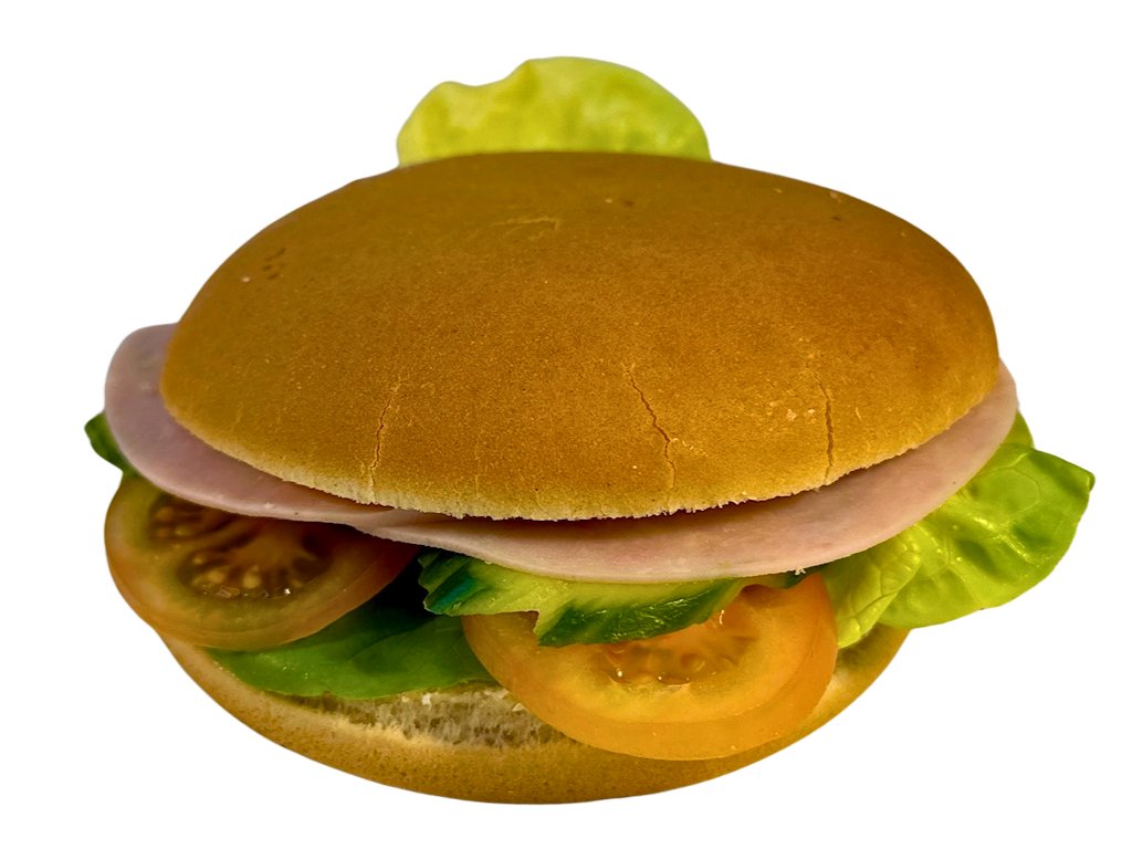 Složení: bulka světlá, máslo, salátový okurek, hamburger dip, čerstvé rajče, šunka, čerstvý salát