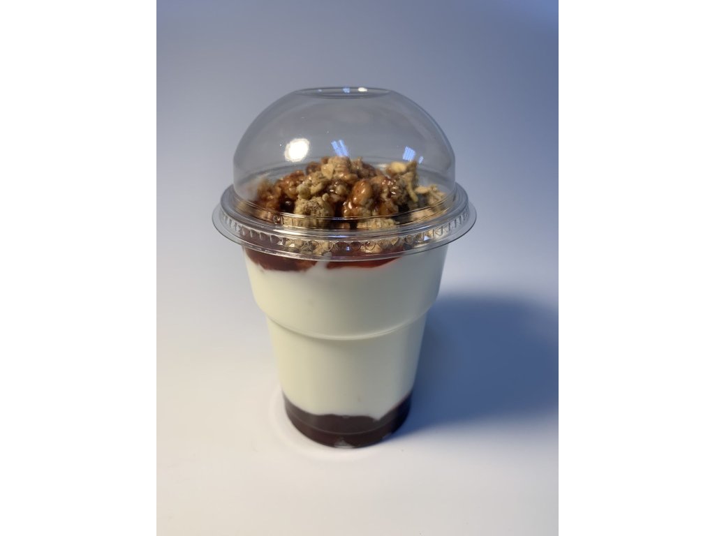 jahodová marmeláda, jogurt, müsli, jahodová poleva
