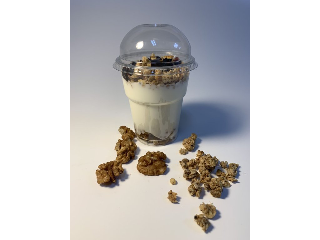 vlašské ořechy, jogurt, müsli, čokoládová poleva