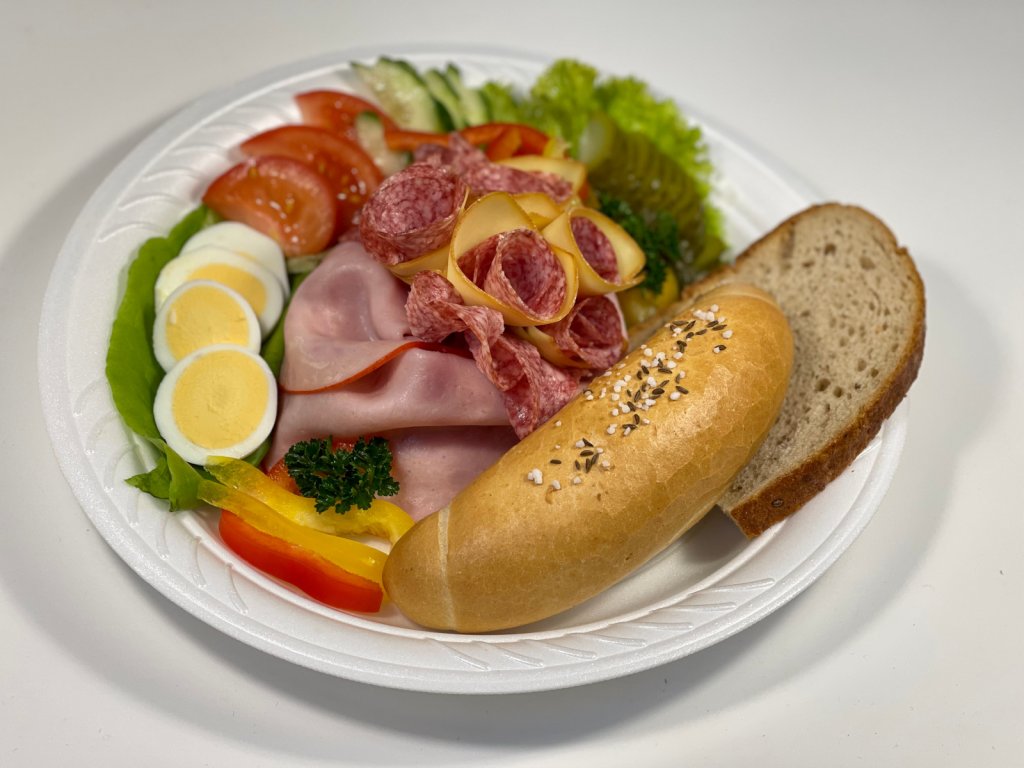 pařížský salát, vepřová šunka, vařené vejce, debrecínská pečeně, salám poličan, uzený sýr, hlávkový salát, čerstvá kápie žlutá a červená, sterilovaný okurek, čerstvý salátový okurek, čerstvé rajče, petrželka