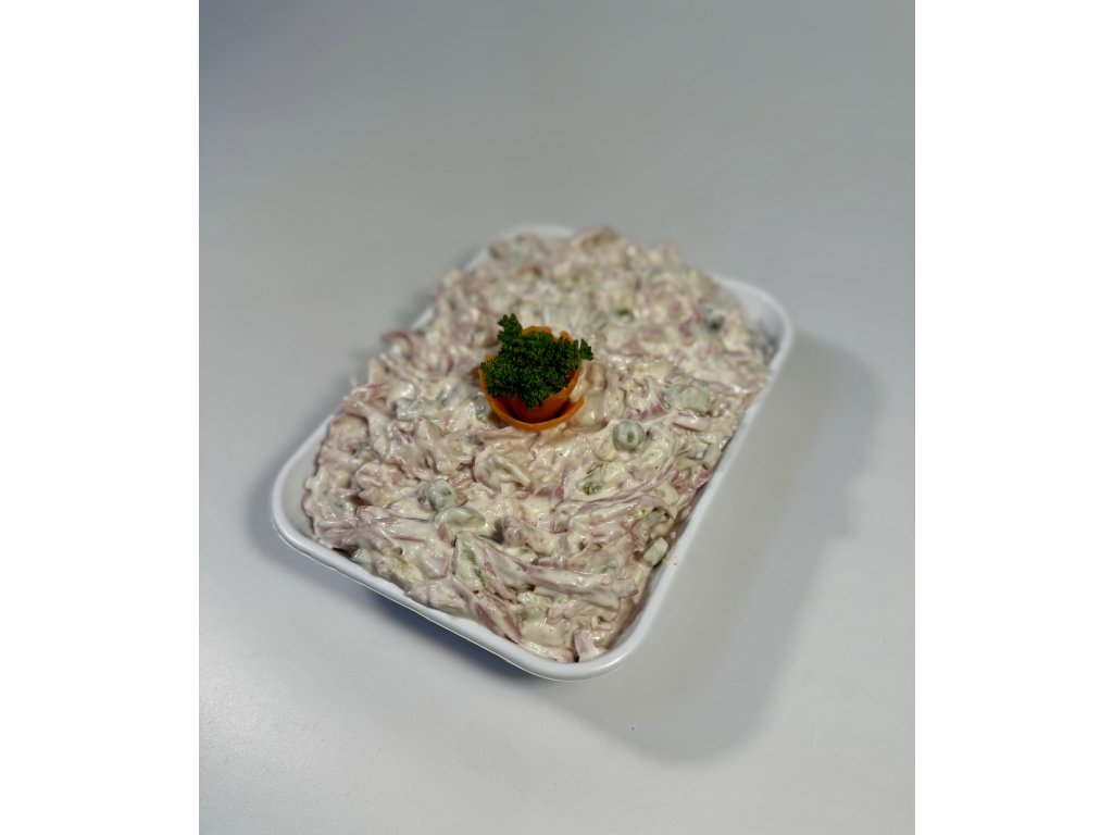 majonéza, salám, sterilovaný okurek, čerstvá cibule, čerstvý hrách, koření