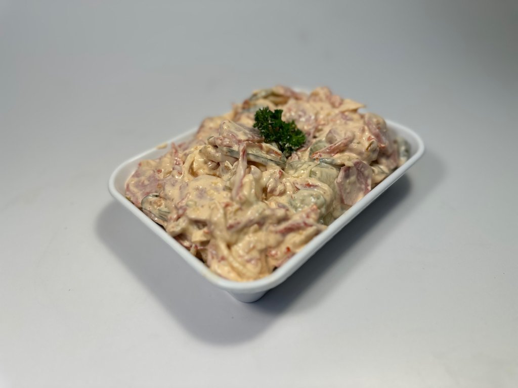 kabanos, majonéza, čerstvá cibule, sterilovaný okurek, červená a zelená paprika, sterilované feferony, koření