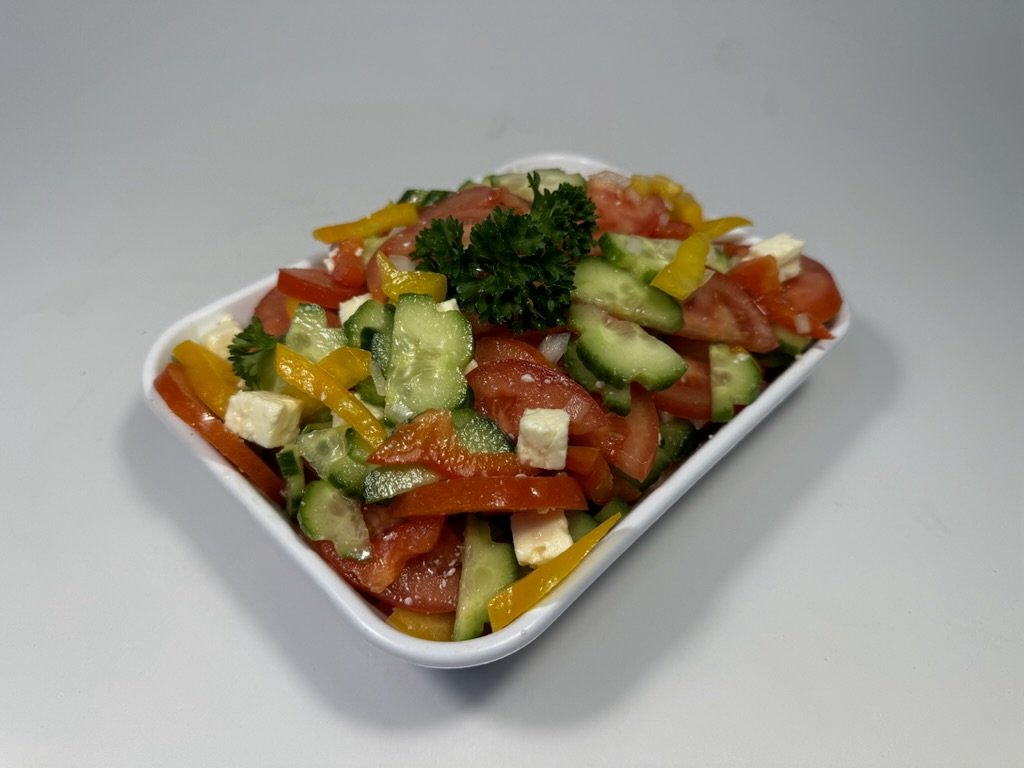 čerstvý okurek, čerstvé rajče, čerstvá paprika, čerstvá cibule, balkánský sýr, olej, koření