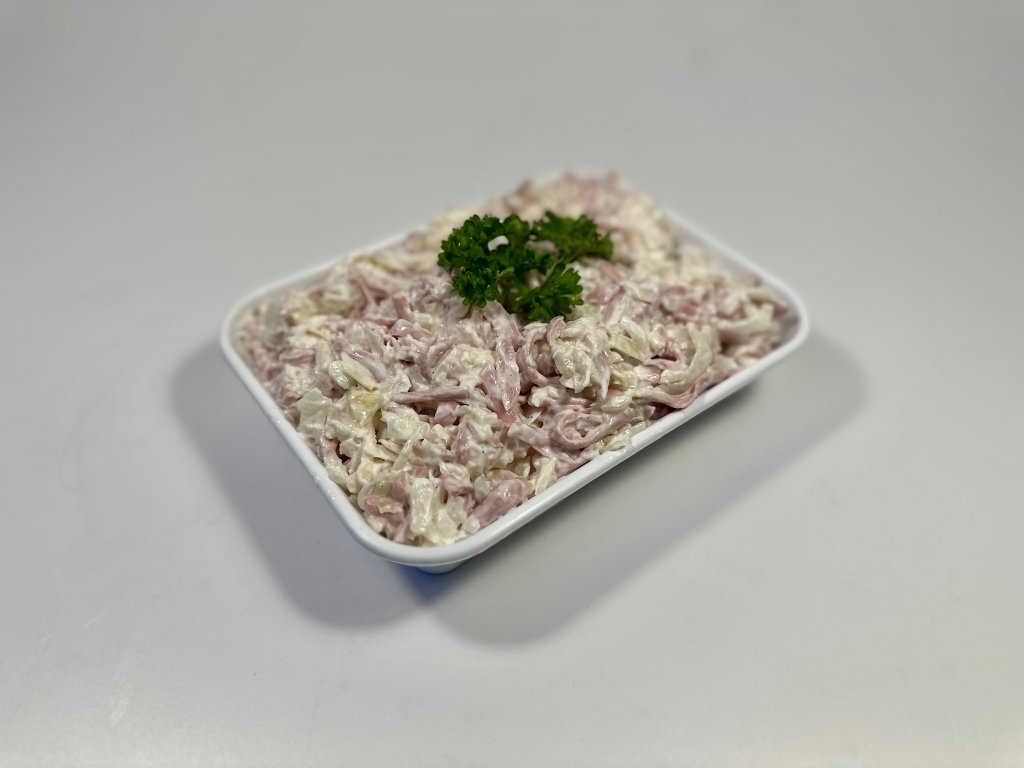 majonéza, sterilované zelí, salám junior, čerstvá cibule, sůl, pepř, ocet