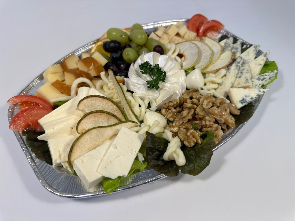 sýr eidam, sýr niva, sýr hermelín, petrželová nať, hroznové víno, uzený sýr, hlávkový salát, salátový okurek, čerstvé rajče