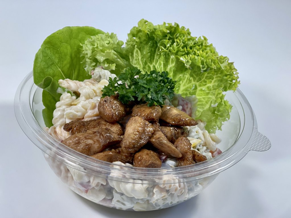 těstoviny fusilli barevné, čerstvá kápie žlutá a červená, yofresh, kuřecí prsní sval, sójová omáčka, salát lolo biondo