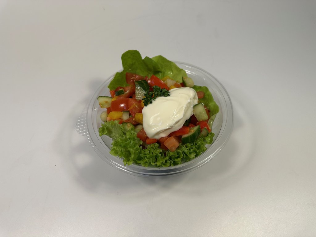 čerstvé rajče, čerstvý okurek, čerstvá paprika, čerstvý hlávkový salát, čerstvý salát ledový, jemný dresing