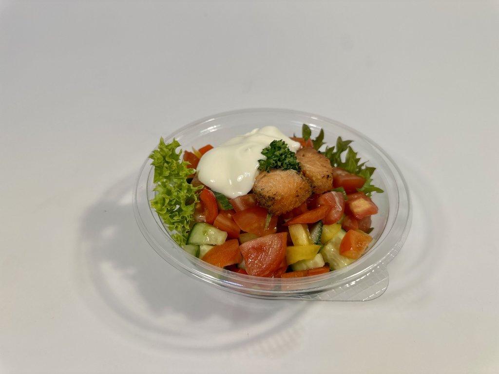 čerstvé rajče, čerstvý okurek, čerstvá paprika, čerstvý hlávkový salát, salát ledový, jemný dresing, jemně grilovaný losos